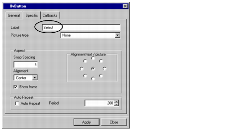 4. In the IlvButton inspector, click the Specific tab to make that notebook page appear. Change the Label field to Select. Click Apply.