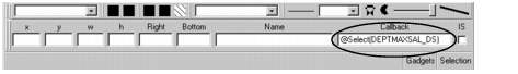 5. With the top button gadget selected, enter @Select(DEPTMAXSAL_DS) in the Callback field of the Generic inspector area in the Main window. If the IS button of the Generic inspector is checked, uncheck it.