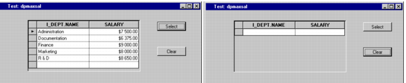 8. Click the Select and Clear buttons successively to see how the callbacks attached to the button gadgets update and clear the table gadget connected to the DEPTMAXSAL_DS data source.