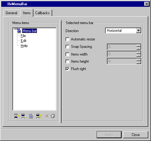 Note: When you want to insert a new item, select the item in the menu bar of the inspector panel before which you want the new item to be inserted and then click Insert. If no item is selected, the item is added to the bottom of the list of items in the tree gadget in the Menu Items box. |