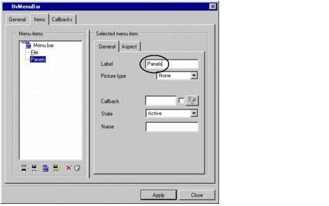 8. In the Menu Items tree gadget, click Edit to select it. You are going to change the label of this menu item from Edit to Panels. In the Selected menu item box on the right side of the Items page, type Panels in the Label field. Notice that the label in the tree gadget on the left changes as you type.