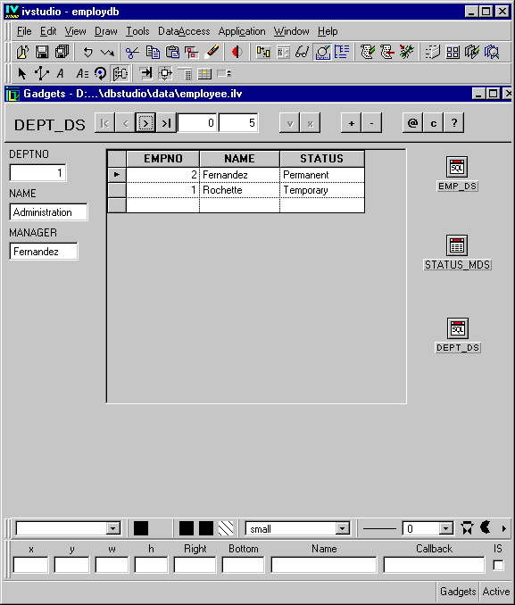 On the left side of the window the DEPTNO, NAME and MANAGER fields represent the three Form Elements. The table gadget is located in the middle of the work space, while on the right side the three icons represent the EMP_DS SQL Data Source Gadget, the STATUS_MDS Memory Data Source Gadget and the DEPT_DS SQL Data Source Gadget, respectively.