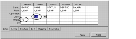 <8 in the Where cell of the EMPNO column to list only those employees whose employee number is less than 8.