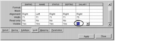3. Click the Look page and change Yes to No in the Visible cell of the Salary column to prevent the SALARY column from being displayed. You may have to use the scroll bar on the left to move down through the rows of the table so that you can see the Visible row.