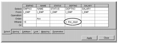 3. Click the Select page in the SQL Data Source inspector. Type the parameter in the Where row of the DEPTNO column like this: = :the_dept