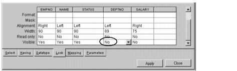 Click the Look page in the SQL Data Source inspector. Change the Visible cell of the DEPTNO column to No.