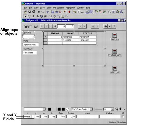 2. To line up the tops of the Employee table and the DEPTNO text field gadget, first click the DEPTNO text field gadget. Then shift-click the Employee table gadget to select both items.