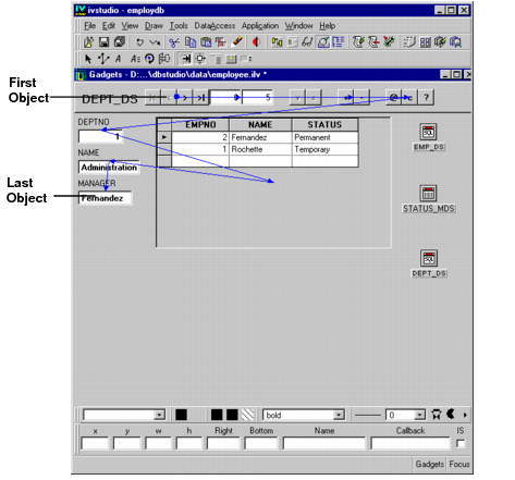 4. Drag a line from the DEPTNO text field object to the NAME text field object. When the NAME object becomes highlighted, release the mouse button.