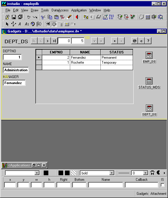 The attachments function allows you to specify how objects in the window change when the window is resized. To specify the attachments for the table gadget in the Employee window so that it will change size proportionally with the window, do the following: