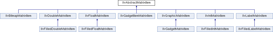 class, which encapsulates the matrix item parameters and behavior. Most of the member functions of this class are virtual. Each item stored and displayed in a matrix must be an instance of a subclass of IlvAbstractMatrixItem