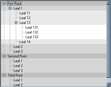 // Read the file that contains the colored tree. container->readFile("../doc/gadgets/tutorials/custgad/data/coltree.ilv"); // Retrieve the tree. ColoredTreeGadget* tree = (ColoredTreeGadget*)container->getObject("Tree"); // Set the background of the tree to gray. // This color will be used as the reference color to compute the children // colors. tree->setBackground(display->getColor("gray")); // Now change the color of each level of items. tree->applyToItems(ChangeColor, (IlvAny)tree); |