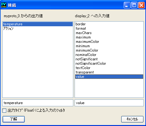 マウスのボタンを放すと「接続」ダイアログ・ボックスが表示され、myproto インスタンスのどの出力値を display プロトタイプのどの入力値に接続するのか尋ねられます。