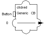 次の例では、値 clicked を持つ sources ライブラリーの random プロトタイプを示しています。clicked 値は、ユーザーがボタンを押したときに 0 を、その出力にプッシュします。この出力は、toggle 値に接続されており、これで running 値を切り替えます。