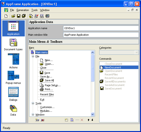 The workspace on the right displays and allows you to set the parameters of the selected entry for each of the application entities.