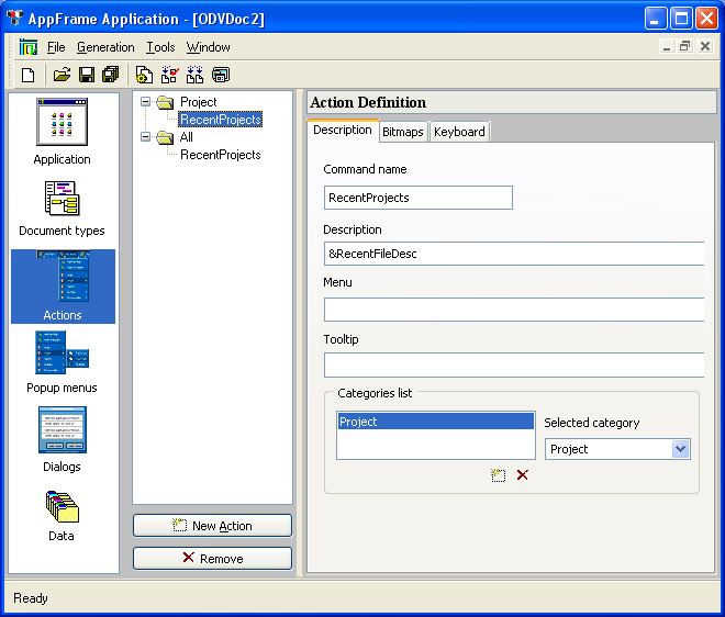 The middle column shows the Actions tree. By clicking either of the RecentProjects in the tree, you display the Action Definition.