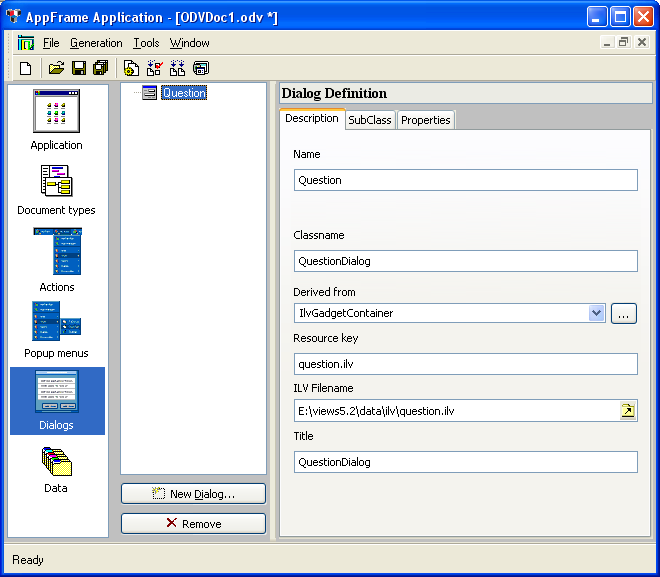Note: To create a dialog box in the Application Framework Editor, you must define a dialog box in Rogue Wave Views Studio and save it (.ilv file). This name is requested when creating a dialog box in the Application Framework Editor. |