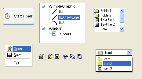 Figure 12.1 shows some of the gadgets that are composed of items. From left to right, you can see a button, a tree gadget, a string list, a pop-up menu, a tool bar, and an option menu.