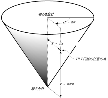 図 3.1 色相、彩度、輝度値 (HSV) モデル