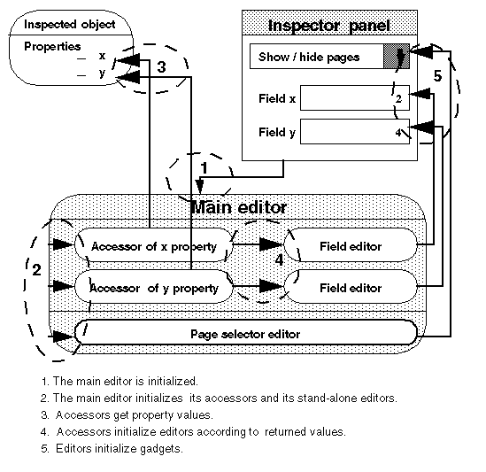 To handle both the pairs accessors/editors and stand-alone editors, an inspector panel makes use of a main editor defined by the class