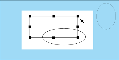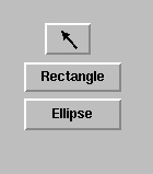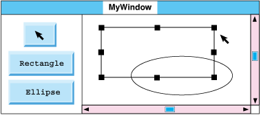 このウィンドウにあるボタンで、矩形や楕円を描くことができ、矢印ボタンで既存のオブジェクトを選択して移動やリサイズができます。スクロール・バーは、広い作業ビューの一部を表示領域に移動します。
