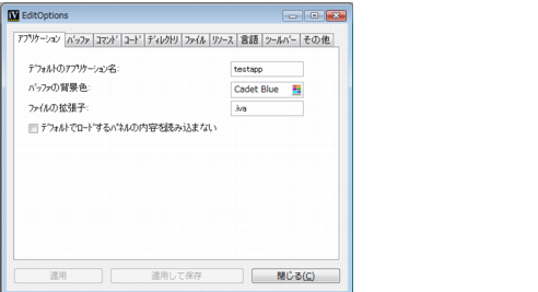 アプリケーション・ページ アプリケーション生成のためのオプションの編集を設定します。デフォルトのアプリケーション名、アプリケーション・バッファー・ウィンドウの背景色、およびデフォルトのファイル拡張子が含まれています。