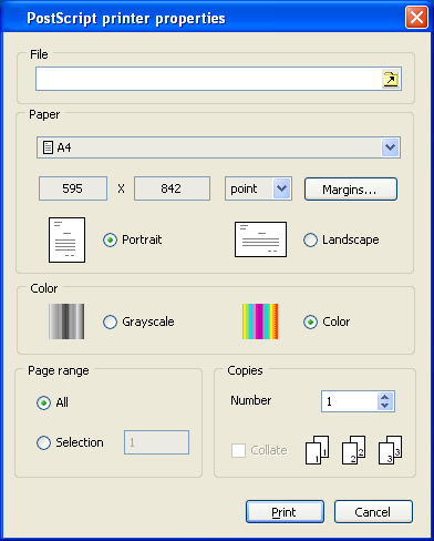 IlvPostScriptPrinterDialog クラスを使用すると、以下のようなさまざまな PostScript 印刷機能を選択できます。