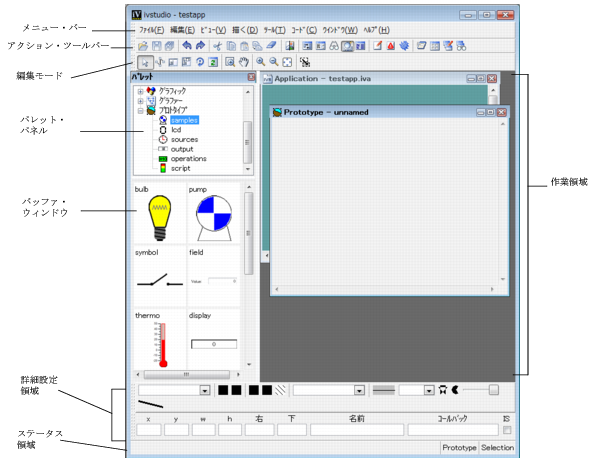 Rogue Wave Views Studio Foundation パッケージのみがインストールされているときと同じ数のメイン・ウィンドウが表示されます。ただし、Protoypes パッケージでは、追加バッファー・ウィンドウ、パレット・パネルでの追加パレット、インターフェースのメニュー・バーおよびツールバーの追加項目へアクセスできるようになっています。次に各項目を簡単に紹介します。
