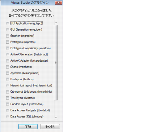 対応するトグル・ボタンをチェックして、読み込むプラグインを選択します。「了解」をクリックします。このセッションで使用するプラグインは、次回 ivfstudio を起動するときに再度読み込まれます。