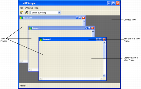 A view frame is a special container with a title bar that encapsulates a client view. Its title bar is composed of an icon, a label, and several buttons. A view frame is displayed inside a parent view, called a desktop view.