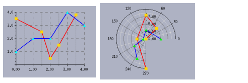 Marked Polyline Displayers in a Cartesian Chart and in a Polar Chart illustrates the fact that a marked polyline displayer can be used with all types of projections. Data sets are represented by marked polyline displayers in a Cartesian chart (using a Cartesian projection) and in a polar chart (using a polar projection).