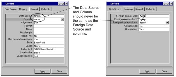 When a gadget is tied to a table column and has a foreign table, you must ensure that the Data Source and Column gadget values are never the same as its Foreign Data Source and Foreign Value Column/Foreign Display Column.