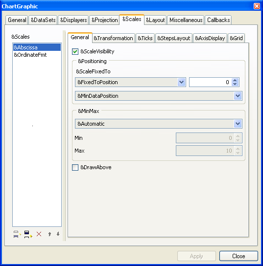 The Scales page lets you define the scales used in the current chart. A chart can have one abscissa scale and as many ordinate scales as you want.