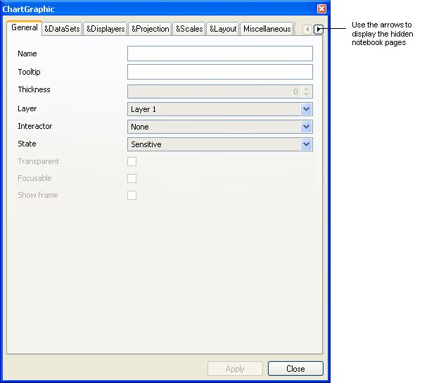 The first and the last pages (General and Callbacks) apply to all graphic objects in general while the others are specific to the chart objects. You will use these pages to define the various elements of a chart.