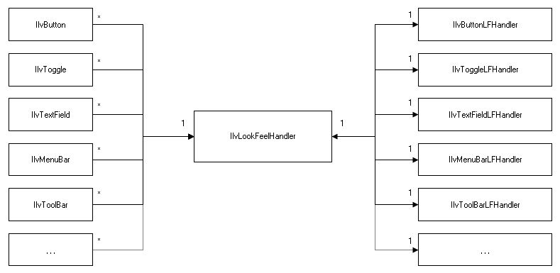 The following diagram shows the relations between the three actors of the look-and-feel process: the objects, the look-and-feel handler, and the object look-and-feel handlers.