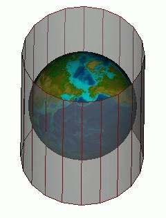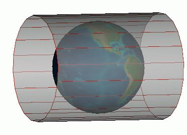 A cylindrical projection is obtained by wrapping a large, flat plane around the globe to form a cylinder. In the following figure, the cylinder is tangent to the equator. The closer the zone of tangency the less the distortion.