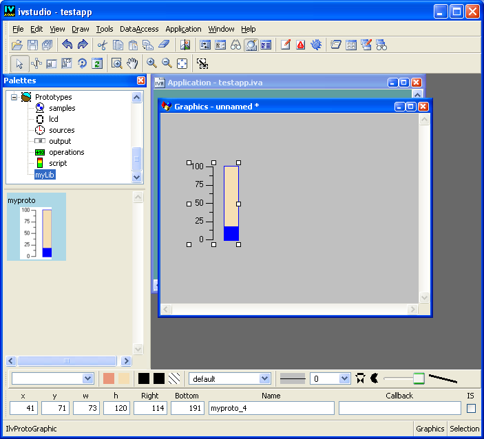 Once a prototype has been created, it can be instantiated in an application buffer window. The application will have access to its attributes when it loads the panel or it can dynamically add instances representing application objects.