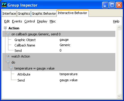 The Callback accessor specifies that when the Generic callback of the gauge is called (through user input), the temperature value will be queried and sent to whatever object listens to the changes of the Action value. These “listeners” can be other accessors of the same prototype, other prototypes, or application objects. By default, adding the Callback behavior has added to itself a “Watch” behavior.