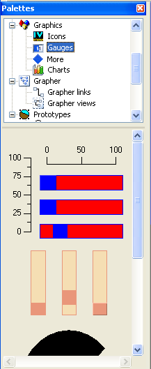 In the upper pane of the Palettes panel, use the scroll bars on the right side of the screen to move down through the list of palettes until the Graphics item appears. Choose Gauges under the Graphics item to display the palette containing gauges and scales.