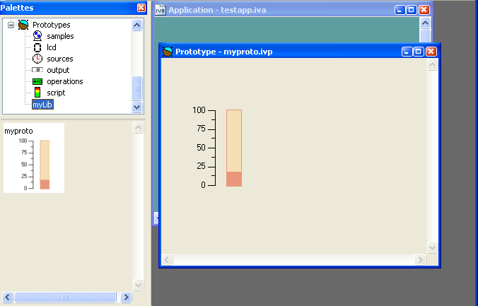 In the Main window, the Prototype buffer window name changes to myproto.ivp and a new prototype icon, labeled myproto, appears in the Prototypes palette on the myLib page.