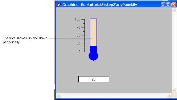 This will periodically update the thermometer values. You can now compile and run your program. You will see that the temperature rises and falls regularly, the thermometer becoming red when the temperature is above the threshold previously set in Views Studio.