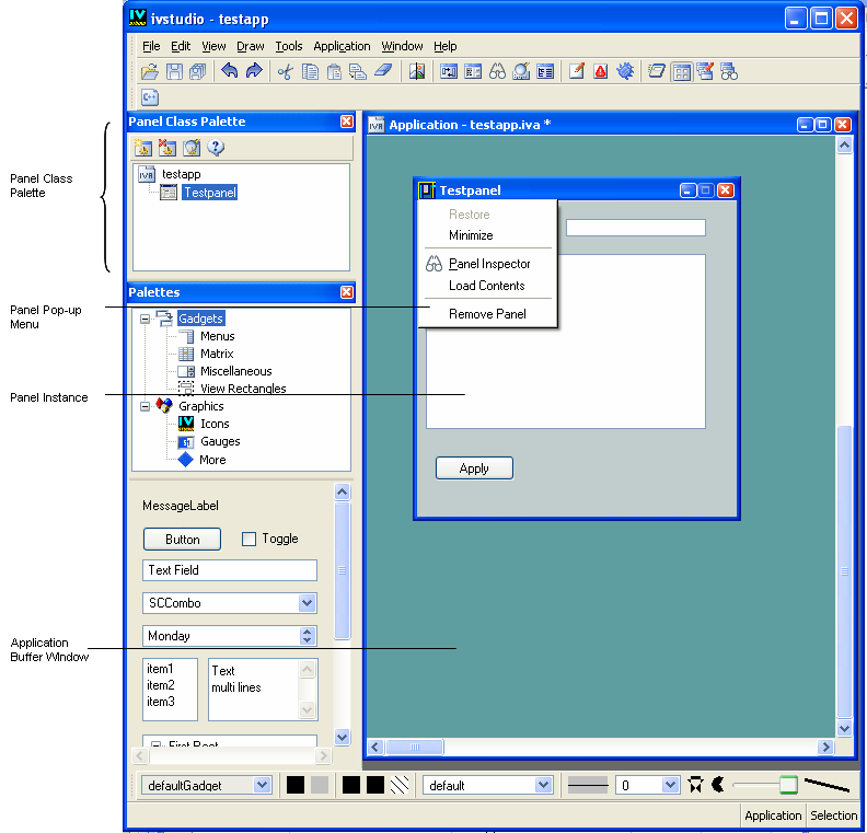 In Views Studio, you edit an application using the Panel Class palette. Panel classes can be added to the Panel Class palette and then dragged to the Application buffer window to create panel instances. A panel instance appears as it will look in the final application. The dimensions and the position of the panel can be directly edited within the Application buffer window.