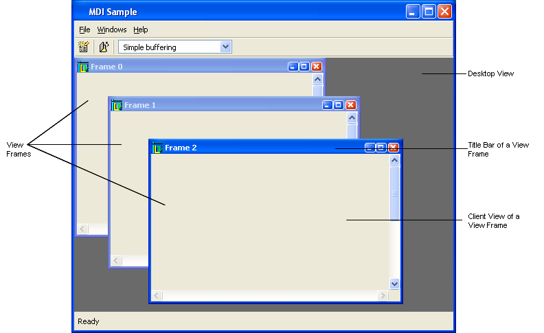 A view frame is a special container with a title bar that encapsulates a client view. Its title bar is composed of an icon, a label, and several buttons. A view frame is displayed inside a parent view, called a desktop view.