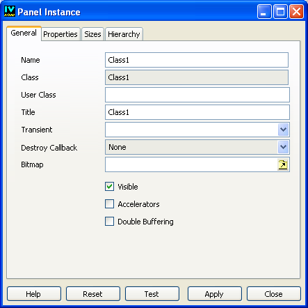 The Panel Class Inspector has four notebook pages: General, Properties, Sizes, and Hierarchy; and five buttons: Apply, Reset, Test, Close, and Help. For a complete description of each notebook page and the fields contained on the page, see Inspecting a Panel Instance.
