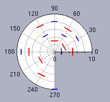 The following images show data sets represented with fixed step displayers in a Cartesian chart (on the left) and a polar chart (on the right).