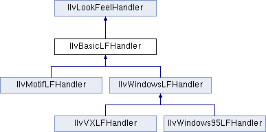 IlvBasicLFHandler is the base class for the predefined look and feel handlers. It implements a few pure virtual member function of its IlvLookFeelHandler base class. This class can be taken as a base class in the process of creating a completely new look and feel handler.