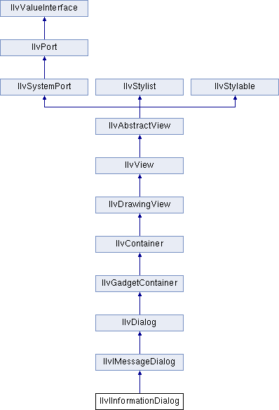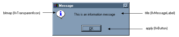 The IlvIInformationDialog class displays information to the user. The names of the graphic objects are displayed to let you change the default look of the dialog.