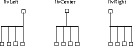 Rearranges nodes in a vertical tree structure, starting from node. The xspacing and yspacing parameters specify, respectively, the horizontal and vertical space between node images. Specify IlFalse for the redraw parameter to prevent the grapher from updating the visible result immediately. The valid values for orientation are: IlvLeft, IlvCenter (compatible with Rogue Wave Views 2.1), and IlvRight, which provide the following outputs: