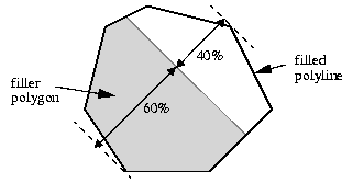 This accessor handles a value of name name that represents a filling ratio. The ratio is a floating-point value between 0.0 and 1.0. When the value is changed, the points of the filler polygon are computed so that it is superposed over the filled polygon (except that it is truncated at the level specified by the fill ratio). The filler polygon can be created initially with any number of points and any geometry: its points will be completely recomputed. The fill ratio defines the height of the filler polygon with respect to the height of the filled polygon, and not its surface. The height is computed in the direction defined by the angle. The example below shows a polyline filled with a polygon at a ratio of 0.6 and an angle of 45 degrees.