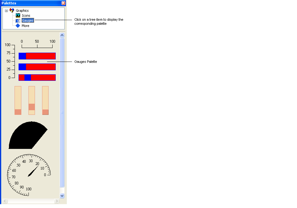 The Palettes panel opens automatically when Views Studio is launched. It is divided into two panes. The upper pane displays a tree gadget with various items, each corresponding to a particular graphic palette. The lower pane displays the objects contained in the palette selected in the tree. To access the palette, you are interested in, click the appropriate item in the tree. For example, to display gauge-related items, click Gauges in the tree in the upper pane of the Palettes panel.