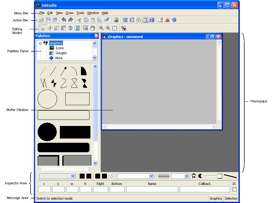 You will create your graphic objects in the buffer windows that are displayed within the Views Studio Main window. When using the Views Foundation Studio, you have access to only one type of buffer window, a 2D Graphics window. By default, an empty buffer window is displayed when Views Studio is launched. The current buffer window type is shown at the bottom of the Main window in the message area.
